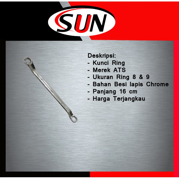 Deskripsi :- Kunci Ring- Merek ATS- Ukuran Mur Baut 8 mm x 9 mm- Bahan Chrome Forged- Kualitas cukup Baik- Tidak Mudah Gompal- Harga Terjangkau- Cocok Tool Rumah Atau Bengkel------------------------------------------------------------------------------------------------------------Kunci Ring Ats Memilki Kualitas yang cukup baik dengan harga yang terjangkau dan cocok alat kelengkapan dirumah maupun bengkel anda. Salam,Sun har