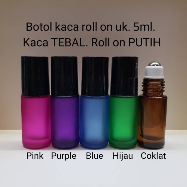 Botol kaca roll on ukuran 5ml dengan bola roll on stainless steel dan plastik PUTIH. Tersedia dalam 5 warna:PinkUnggu Biru Hijau Coklat Mohon mencantumkan warna yang diinginkan. Bila tidak ada keterangan, kami akan kirim secara acak.Harga adalah harga sa