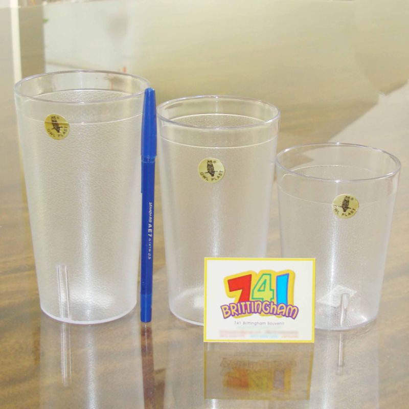 Owl Glass 500 ml (Gelas Plastik Owl 500ml)Harga untuk 1pcBarang ASLI / originalBarang baru, tanpa segel plastik dari pabrikMerk Owl PlastBagian luar seperti kulit jeruk supaya tidak licin saat dipegangBagian dalam licin (tidak kulit jeruk) sehingga mudah dibersihkanBahan plastik, kuat & tidak mudah pecah sehingga aman dipakai anak-anak Food grade, aman dipakai minumTahan panas dan dinginBanyak dipakai di rumah makan/ restoran karena praktis & anti pecahDapat juga dipakai sebagai toiletries glass di hotelDimensi barang +/-:Volume 500 mlTinggi 15 cmDiameter atas 8.5 cmDiameter bawah 6 cmNOTE: warna ada yg agak putih transparan, ada yang agak semu biru/ungu/abu. Tidak bisa pilih warna karena tergantung kiriman dari pabrik.Pada foto pertama, ukuran 500ml gelas paling besar di ujung kiri.Tersedia juga ukuran 250 ml dan 350 ml (ada di etalase produk terpisah)Untuk pengiriman kena volume, 1 kg muat 8 pcs.Untuk pembelian jumlah banyak & alternatif pengiriman lain yang lebih murah, bisa langsung chat ya..Thanks & happpy shoppingterima