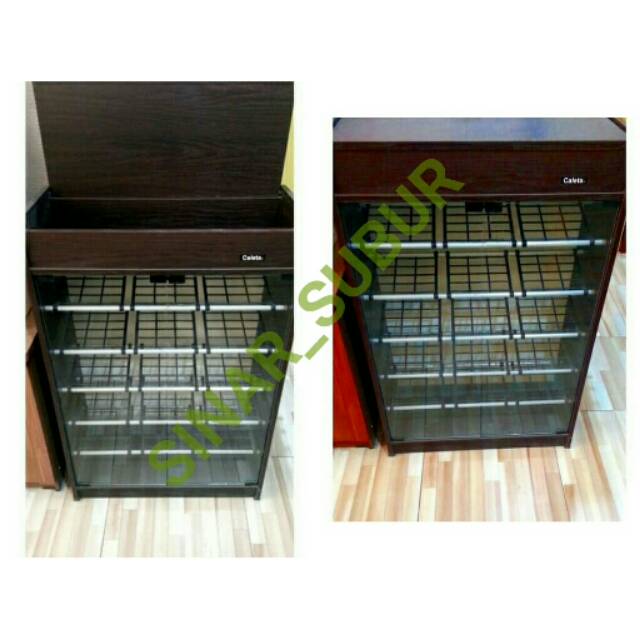 Rak Sepatu Caleta 1507. Kapasitas: 18 pasang sepatu.Bentuk / disain rak menyerupai lemari, dengan 2 pintu dari bahan kaca.Rak dari bahan yang bemutu baik .Rak yang kokoh, kuat dan tahan lama.Keunggulan:menggunakan kacatransparansehingga anda dapat melihat isi rak sepatu anda tanpa membuka terlebih dulu.pada bagian atas dilengkapi tempat untuk menyimpan kaus kaki, sikat, semir, dsb.Kapasitas:18 pasang sepatuUkuran:P: 69 cm x L: 30 cm xT: 106 cmKetebalan:15 mmMaterial:kayu partikelsilahkan membeli buble warp untuk packing kaca , kami tidak bertanggung jawab jika kaca pecah di jalan sebelum di kirim kami sudah cek dan pastikan kaca dalam keadaan baik.terimk